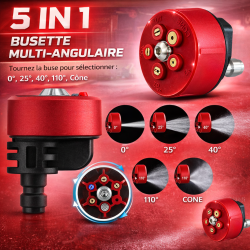 Fini le changement de buses en plein travail ! Grâce à son système 5 en 1 rotatif, la MULTIBUSE vous permet d’ajuster instantanément la pression et l’angle selon la surface à traiter :